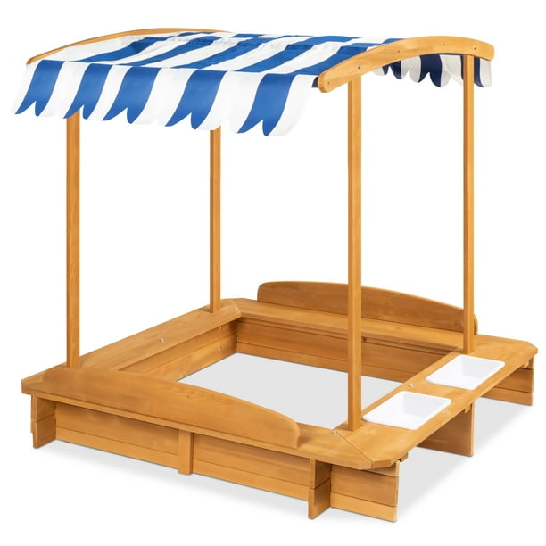 Kids Canopy Covered Cedar Sandbox With Foldable Bench Seats By
